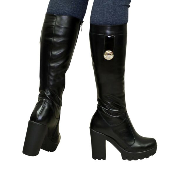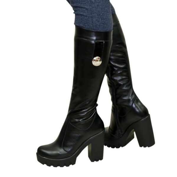 Классические женские сапоги из натуральной кожи черного цвета, красивые и стильные, на высоком стойком каблуке. Декорированная фурнитура в виде броши. Объем голени можно заказать для любого размера.