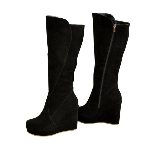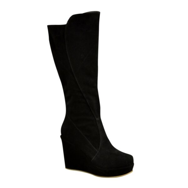 Классические женские сапоги из натуральной замши черного цвета, на голенище имеется широкая вшитая резинка сбоку сапога для дополнительного объема голени, удобные, практичные и стильные, на стойкой платформе. Объем голени можно заказать для любого размера.
