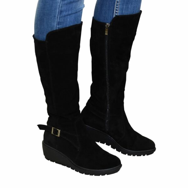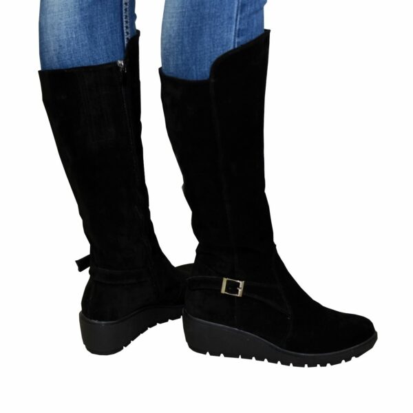 Женские сапоги из натуральной замши черного цвета, декорированные ремешком, на танкетке. Объем голени можно заказать для любого размера.