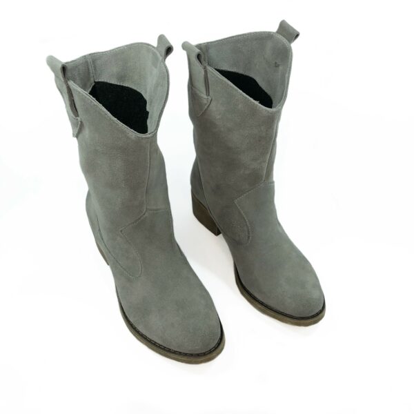 Женские сапоги казаки из натуральной замши серого цвета на не высоком каблуке, прямой обуви.