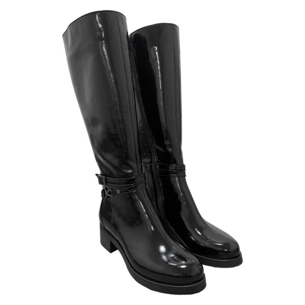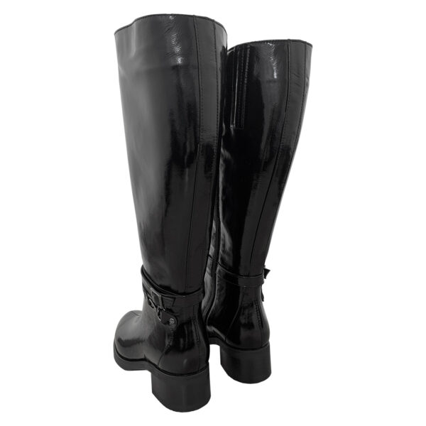 Стильні жіночі чоботи із натуральної лаковой шкіри чорного кольору, з гумкою у верхній частині чобота, на потовщеній підошві із стійким підбором.