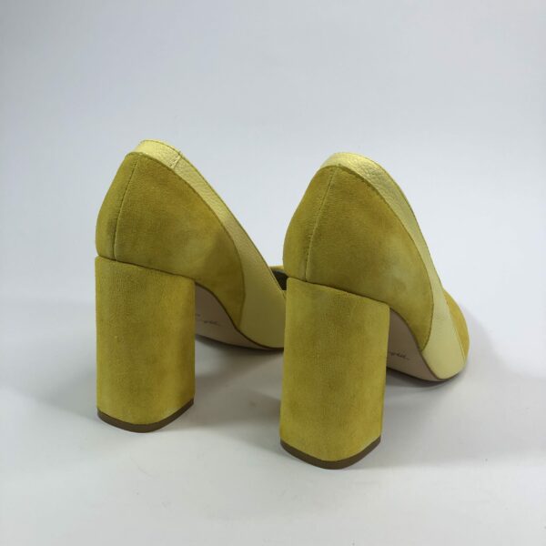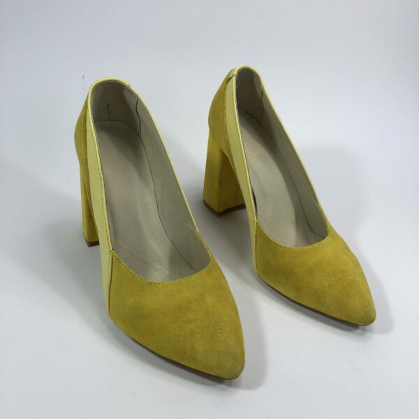 Выходные классические красные туфли-лодочки на высоком каблуке обтянутом желтой замшей. Выполнены из натуральной желтой замши и желтой кожи. Высота каблука 9.5 см. Ручная работа с использованием исключительно натуральных материалов высокого качества. Соответствуют стандартной сетке размера. Рассчитаны на стандартную полноту бедра. Возможен отшив в коже, замши разных цветов.