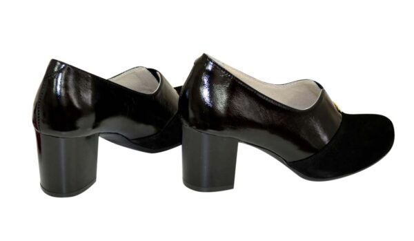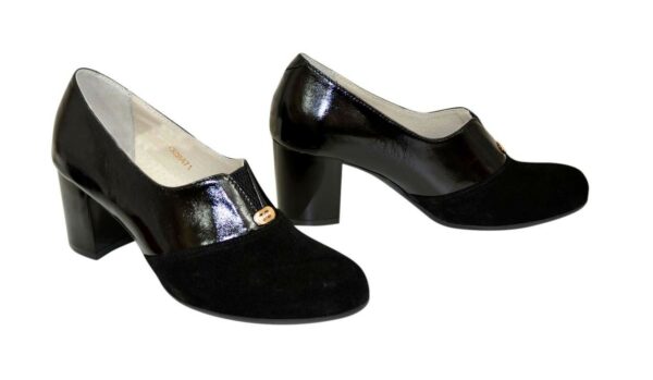 Женские туфли благородного черного цвета из натуральной замши, комбинированные натуральным лаком на широком стойком подборе (6см). Украшенные фурнитурой. За счет резинки вшитой на подъеме – подойдут на ножку с подъемом. Удобные и практичные, хорошо смотрятся на ноге. Пару по праву можно назвать универсальной и совмещенной с любым хитом вашего весенне-летнего гардероба. Соответствуют стандартной размерной сетке. Возможен отшив в коже, замши разных цветов. Также у нас работает услуга «Индивидуальное изготовление». С помощью этой услуги можно создать маленькую коллекцию, используя свои любимые цвета. ТМ zlata-studio найдем подход к любому клиенту.