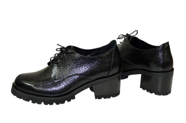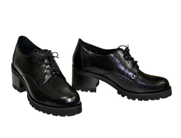 Закрытые женские туфли из натуральной кожи питоном черного цвета, на широком стойком подборе высотой 5 см. спереди 1.5 см. Благодаря шнуровке подойдут большой подъем. Ручная работа с использованием исключительно натуральных материалов высокого качества. Полномерные, соответствуют стандартной сетке размера. Рассчитаны на стандартную полноту бедра. Возможен отшив в коже, замши разных цветов.