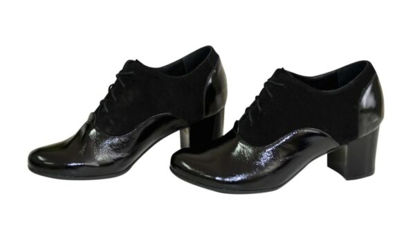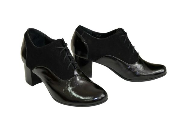 Туфли классические женские из натуральной замши и лаковой кожи черного цвета на стойком подборе высотой 6 см. Ручной работы с использованием исключительно натуральных материалов высокого качества. Полномеры благодаря шнуровке подходят на большой диапазон ног. Соответствуют стандартной размерной сетке. Возможен отшив в коже, замши разных цветов.
