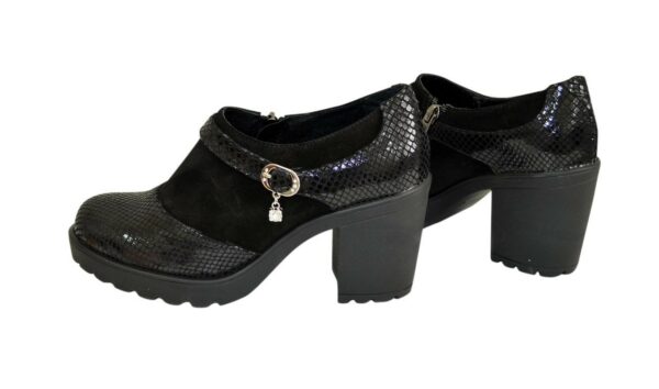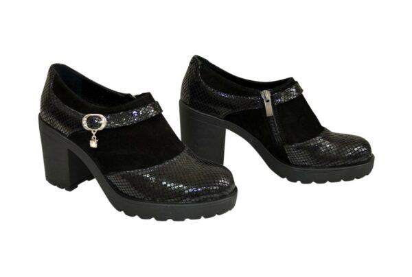 Закрыты женские туфли из натуральной из замши и питона черного цвета, на не высоком стойком подборе в высота 7,5 см, впереди 1,5 см . На молнии. Ручная работа с использованием исключительно натуральных материалов высокого качества. Полномерные, соответствуют стандартной сетке размера. Рассчитаны на стандартную полноту бедра. Возможен отшив в коже, замши разных цветов.