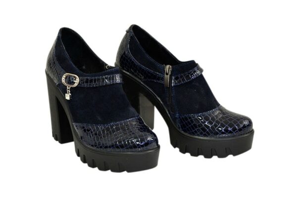 Закрыты женские туфли из натуральной кожи питон и замши синего цвета, на высоком стойком подборе 10,5 см, впереди 2,5 см . На молнии. Ручная работа с использованием исключительно натуральных материалов высокого качества. Полномерные, соответствуют стандартной сетке размера. Рассчитаны на стандартную полноту бедра. Возможен отшив в коже, замши разных цветов.