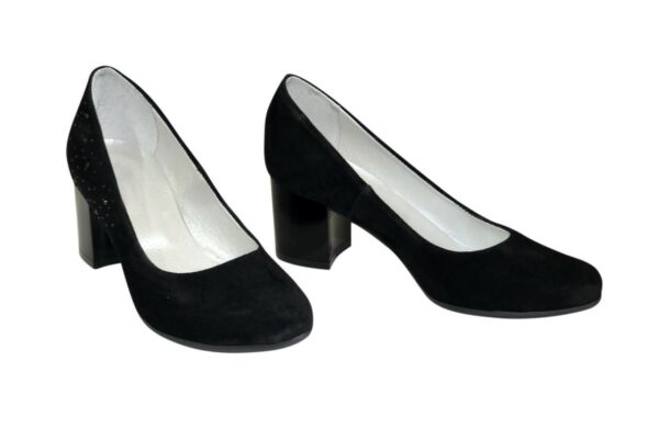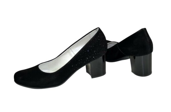 Лодочки-туфли классические женские из натуральной черной замши, декорированные камнями, на стойком подборе высотой 6 см. Ручной работы с использованием исключительно натуральных материалов высокого качества. Соответствуют стандартной размерной сетке. Возможен отшив в коже, замши разных цветов.